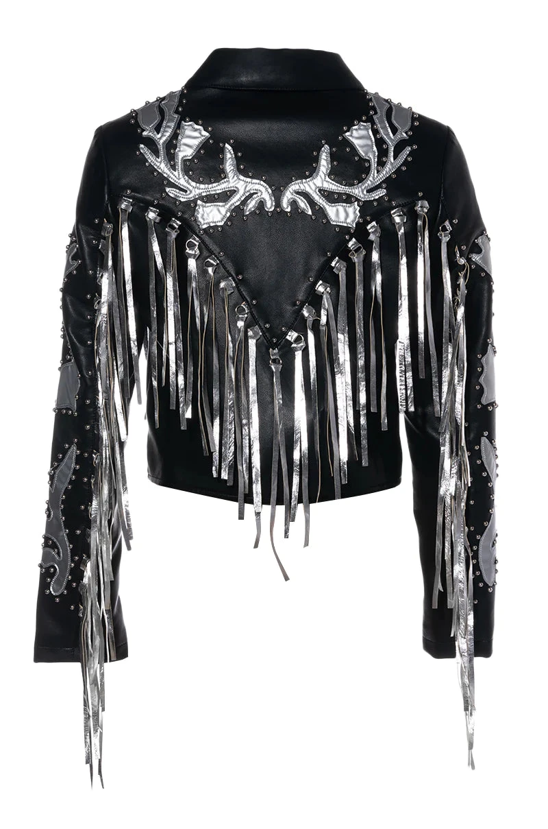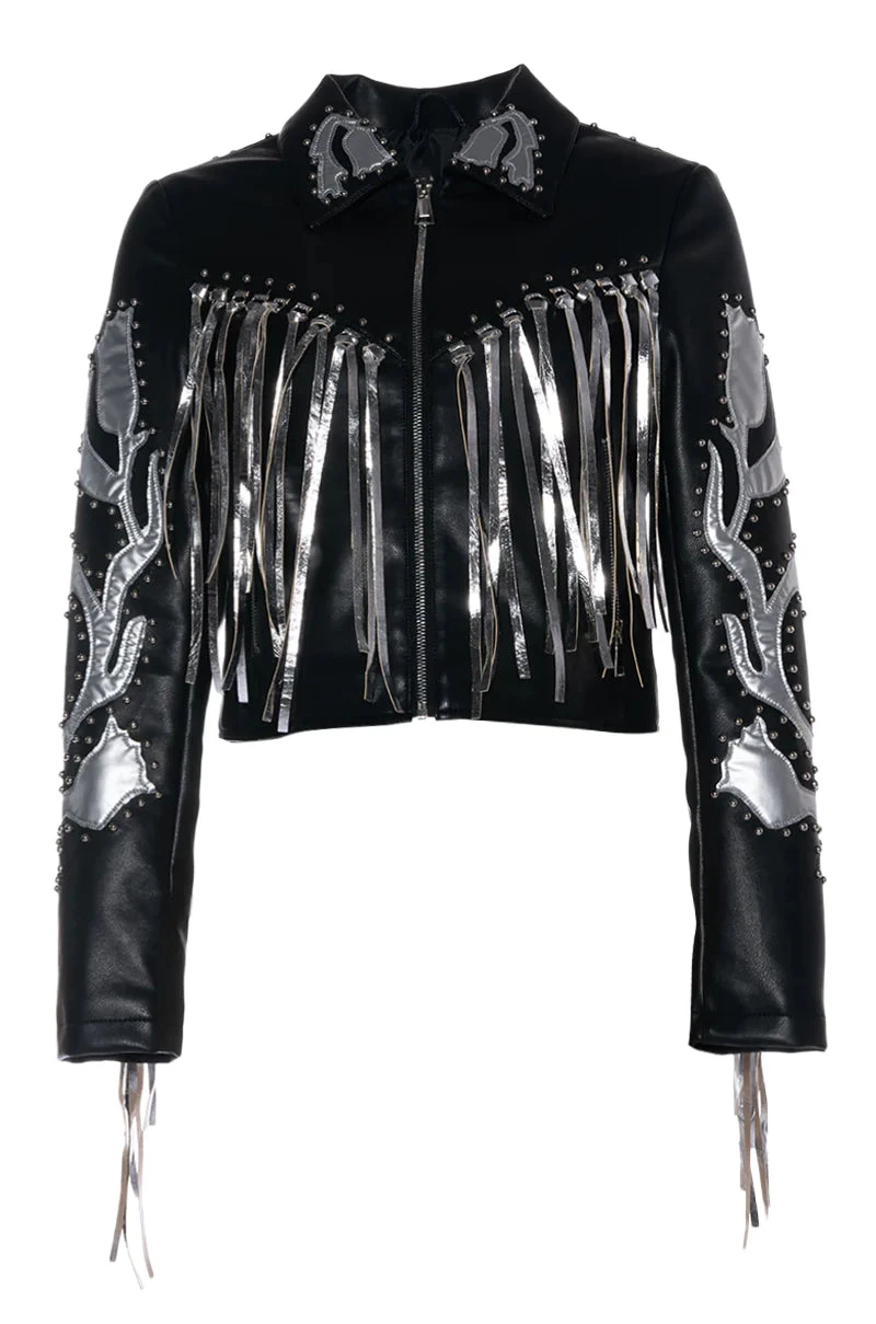 Get ready for this years festival season with Ride-Em Western! This jacket features fringe detailing along the front and the back. It has a zipper closure along the front with a fold over collar.