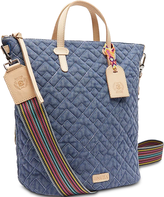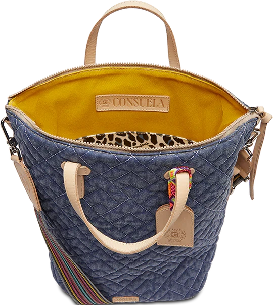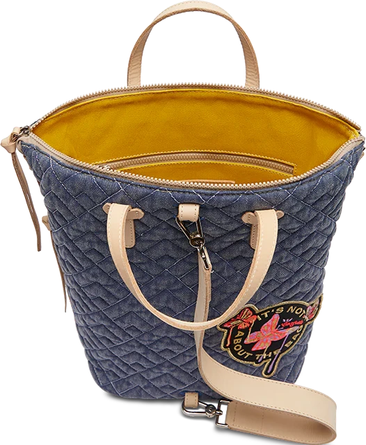 - Quilted blue denim exterior with embroidered patch