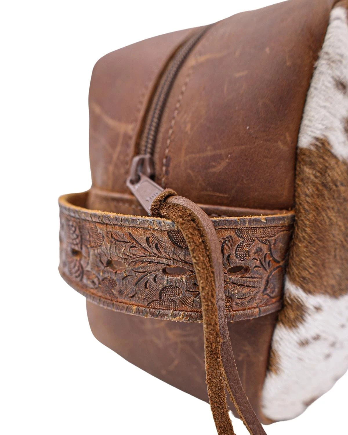 - Zip closure with leather pull
