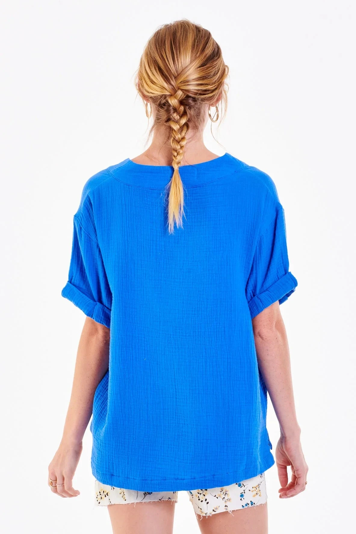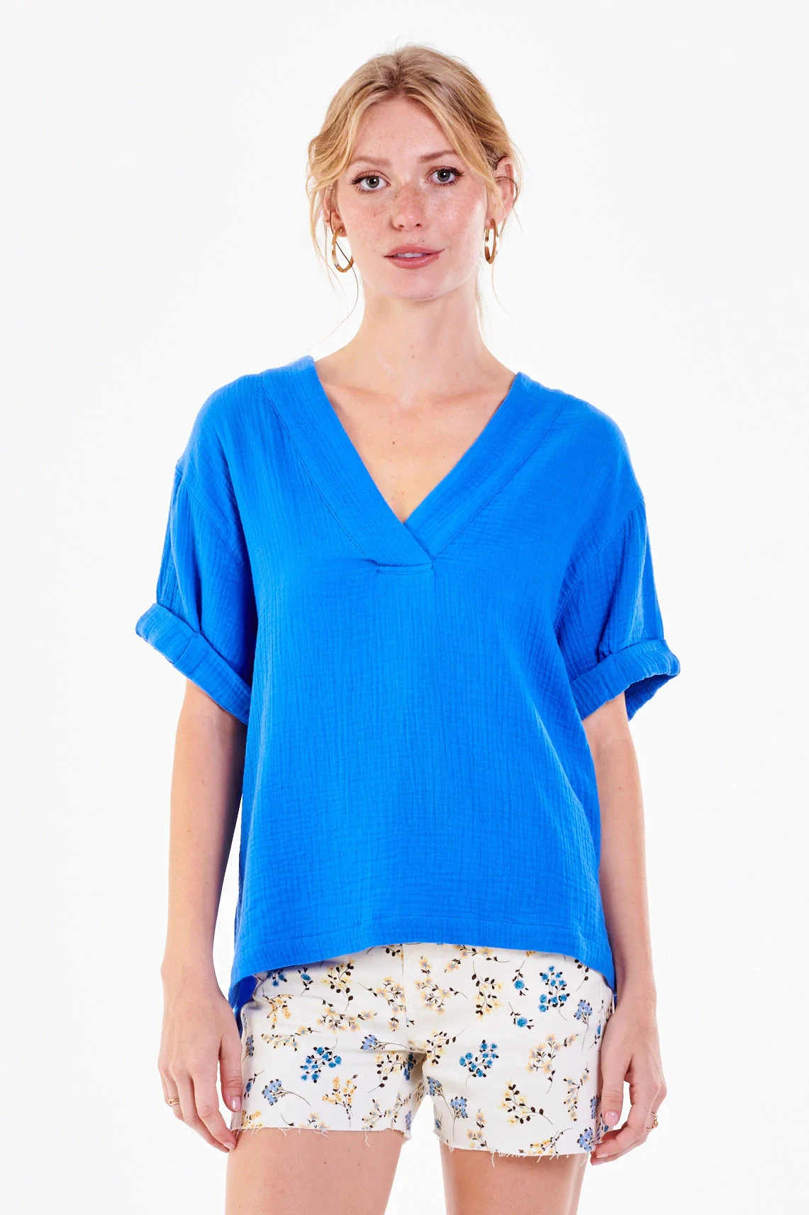 Rolled short sleeve, v-neck top with overlap neck band finished drop shoulder in gauze softness. The practical piece call-out sophistication, flaunting the innate confidence vibe of “Yes-I-Can” to anything. Solid color woven on relaxed fit.