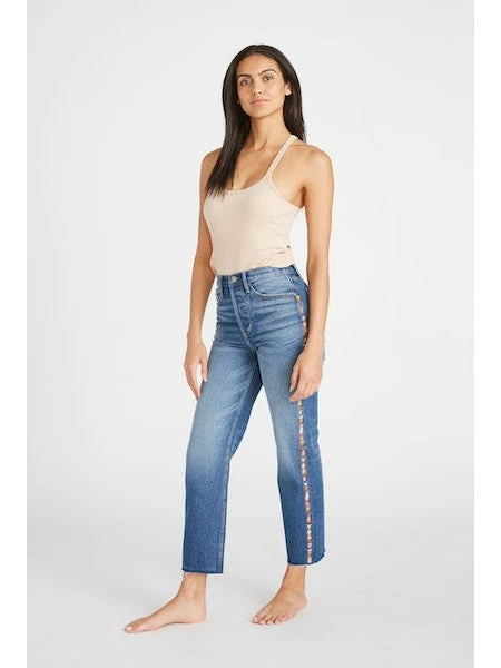 Our Driftwood Royce x Kaleidoscope jeans offer a fresh take on classic denim. Crafted by driftwood denim with a medium wash and side embroidered detail, these jeans deliver effortless style with an elevated twist. Show off a cropped hemline and stand out in bold fashion!