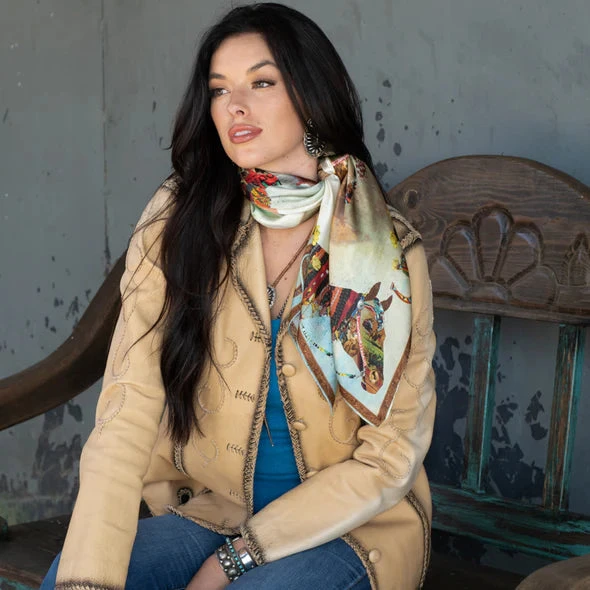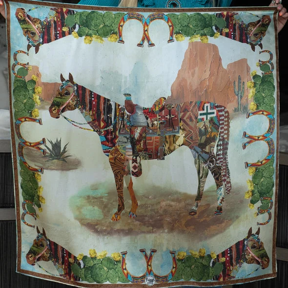 The Haute Horse comes in our Shorty sizes and is 100% Satin Silk. Designed by my friend Amy Moorhouse, this one is full of detail. You might want to grab a coffee and sit down with this scarf for an hour or so to see what you can find hidden in this collage design – using pieces of jewelry, rugs, tapestry and collectibles.Â