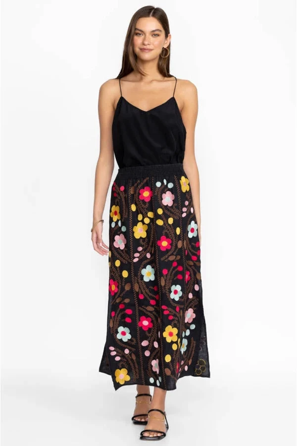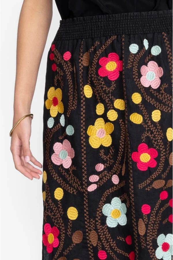 Designed from pure linen, this Joni High Slit Linen Skirt is perfect for a day spent dining under soft rays of sunshine. Crafted in jet black, this skirt boasts a smocked waist for a comfortable fit, a high slit for easy movement, and a happy floral placement embroidery in rich shades. For the day, style with a plain tee and flats, and in the evening, opt for a silk blouse and heels. Product Details: • 100% Linen • Placement Embroidery • Smocked Waist • Model Height: 5’11” • Model is wearing a size Small • Measurements for Size Medium: Waist- 22″, Length- 39″ • Care instructions: Machine wash cold. Non chlorine bleach when needed. Tumble dry low. Warm iron.