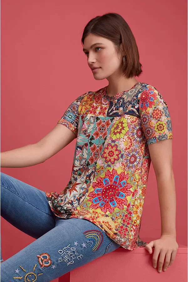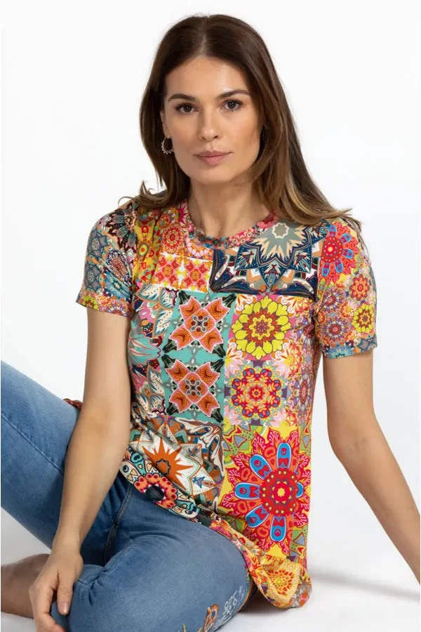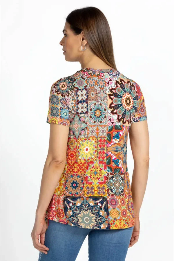 Crafted from bamboo with added stretch, the Kalieda Favorite Short Sleeve Crew Neck Swing Tee is tinged with a psychedelic feel. This swing tee is cut in a regular fit with a slight flare at the hem and boasts a round neck, short sleeves, and a hypnotic print inspired by kaleidoscopic patterns. Keep this tee as the focal point of your ensembles by pairing with plain pants or shorts. Product Details: • 95% Bamboo 5% Spandex • Short Sleeves • Swing Tee • Model Height: 5’9″ • Model is wearing a size Small • Measurements for size Medium: Length- 26 1/2″ Bust- 38″ • Care instructions: Machine wash cold only. Non chlorine bleach when needed. Tumble dry low. Warm iron.