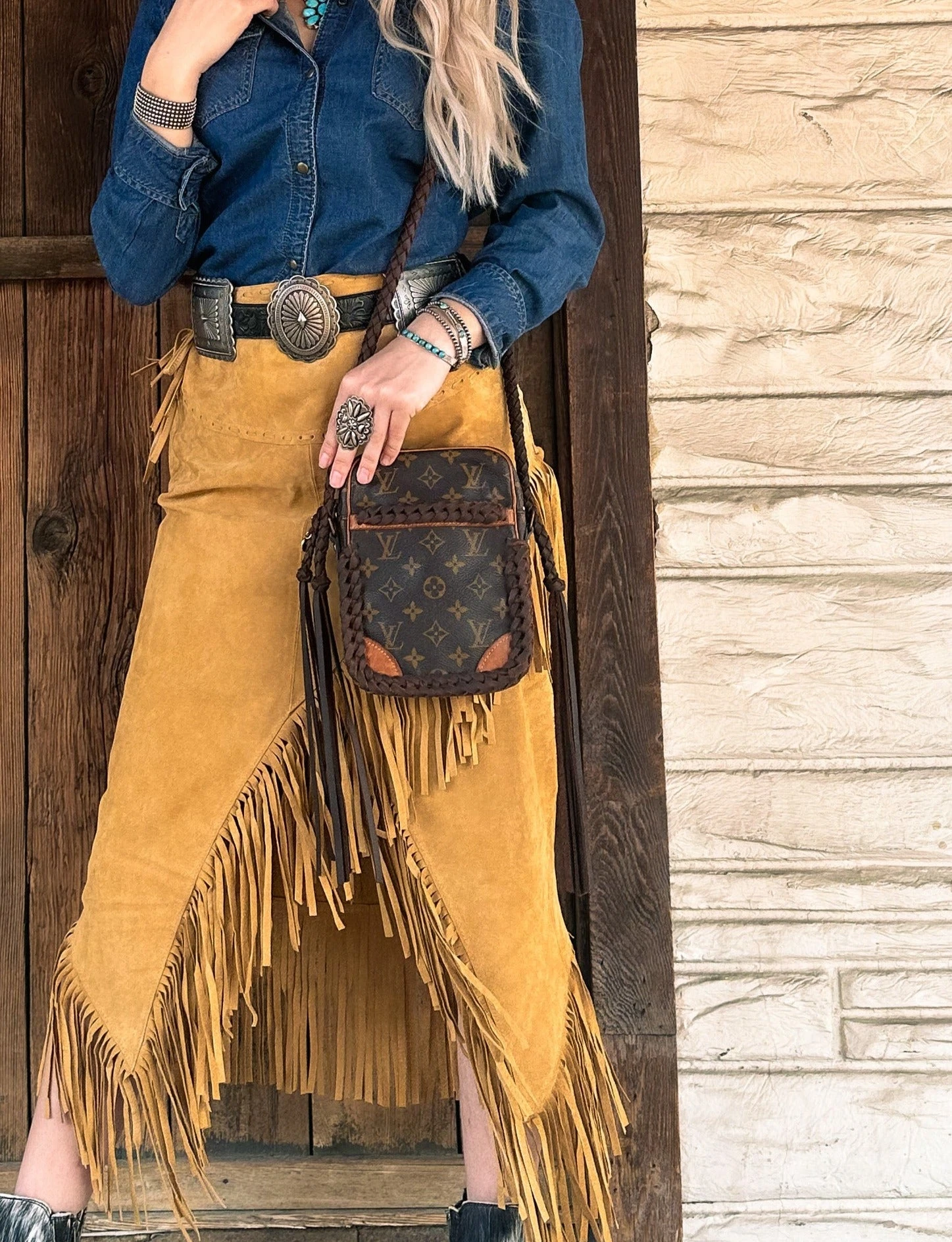 The strap is hand braided and attached at a standard of 46”. The strap is braided round into flat along the top to lay more comfortably across the shoulder.
