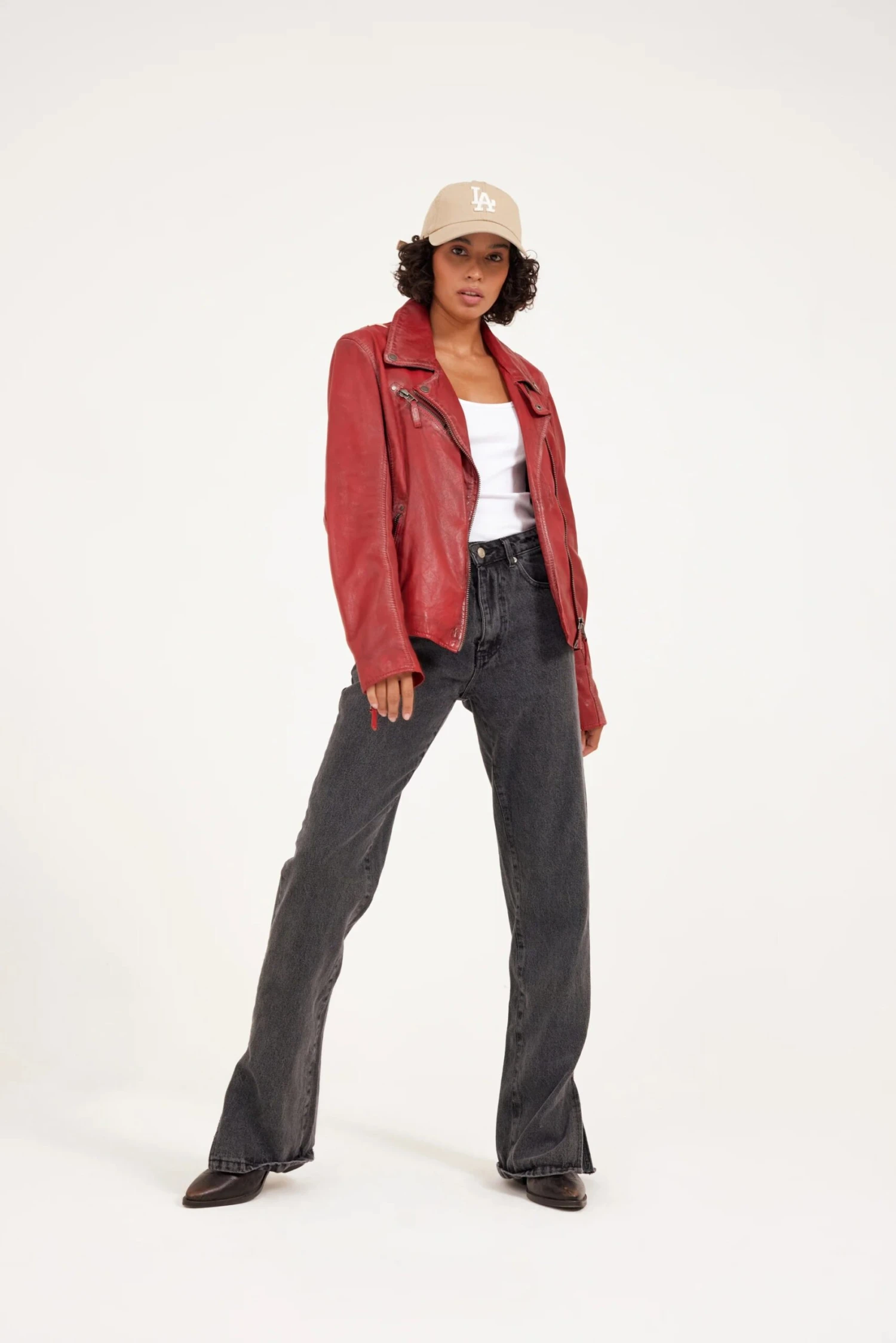 Ahhh… the famous star jacket – highlighted in many cameos on tv and movies, this style announces she has arrived. Made of 100% vegetable tanned and ethically produced lambskin leather, this jacket will catch the eye of many admirers. The seams are gently polished to ensure a distressed effect, the inside of the pockets, inside of the cuff zips and under the collar give a fabulous contrast pop of color!