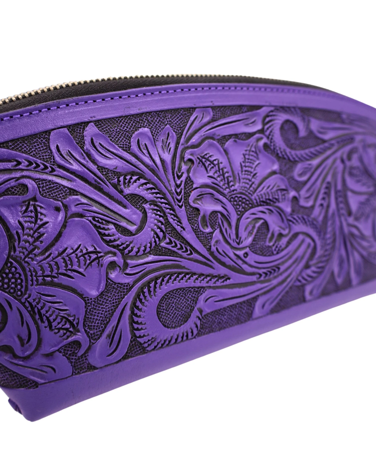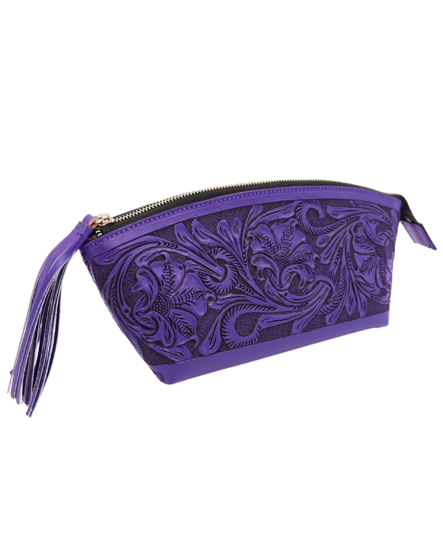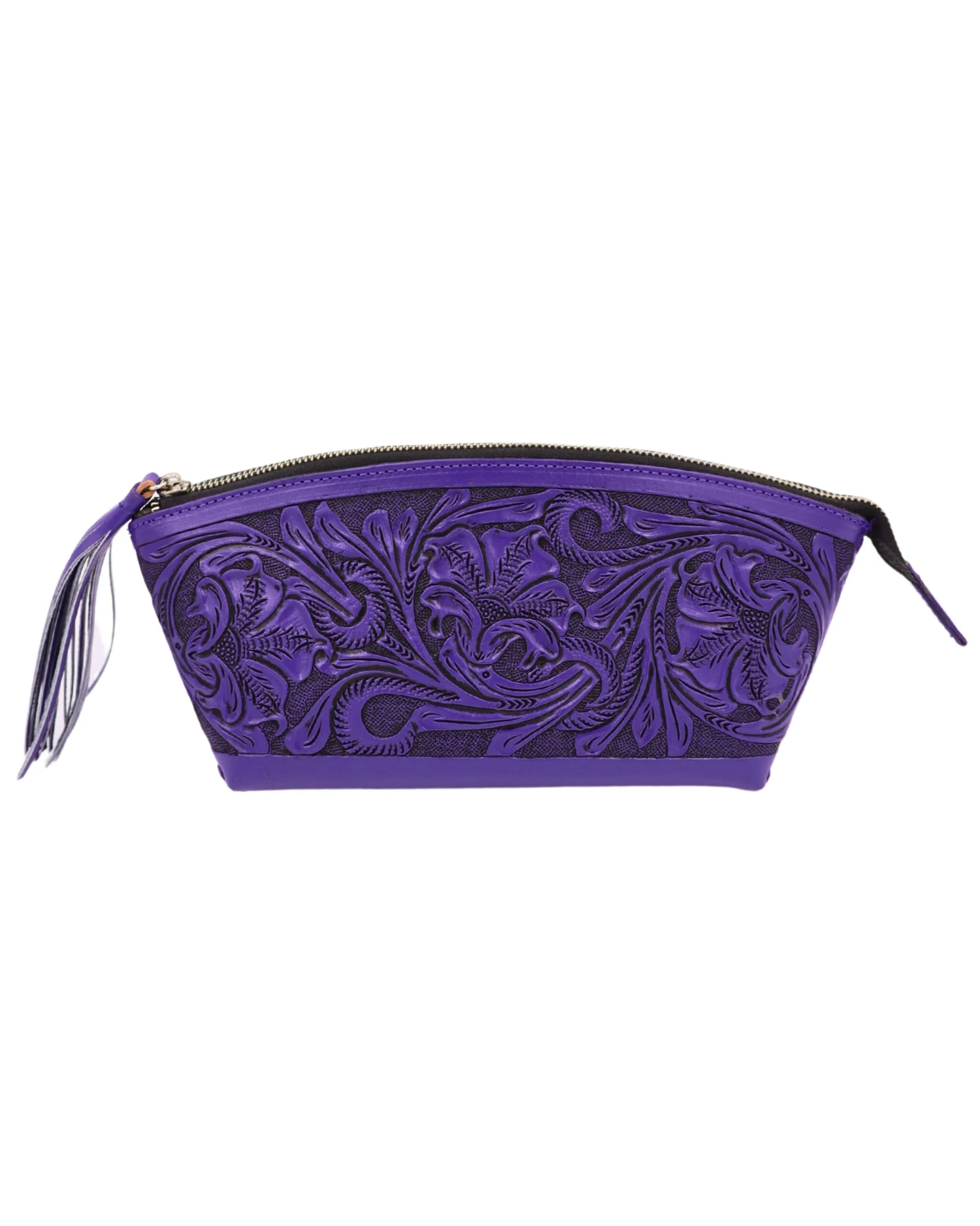 This Que Chula genuine leather cosmetic bag features a beautifully intricate floral engraving that makes it truly stand out. It also has a zipper enclosure with a leather tassel.