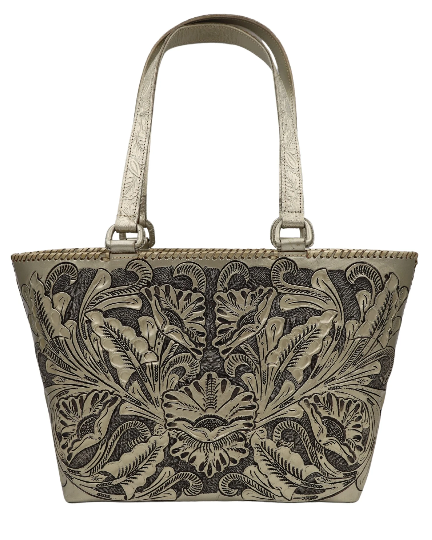 Sophisticated hand tooled leather purse from Mexico. Featuring a beautifully intricate floral design on the front and leather braiding design on the back. It also contains a zip closure and suede interior with an interior zipper pocket and 2 interior slip pockets.