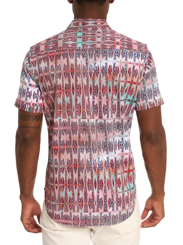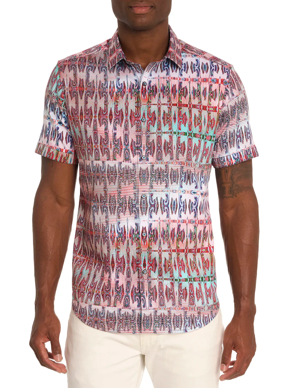 Abstract geometric motif on an ombre ground lights up this short sleeve shirt in fiery tones. Flip the collar and cuffs for an even more colorful abstract pattern.
