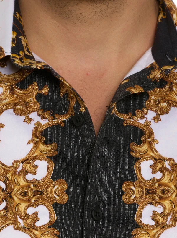 Aptly named, this long sleeve shirt reflects the ultimate in luxury, with a gold scroll print on damask fabric given texture and nuance with touches of rich embroidery. Ghosted in the background is a subtle tone on tone paisley pattern. Flip the cuffs for even more #WearableArt.