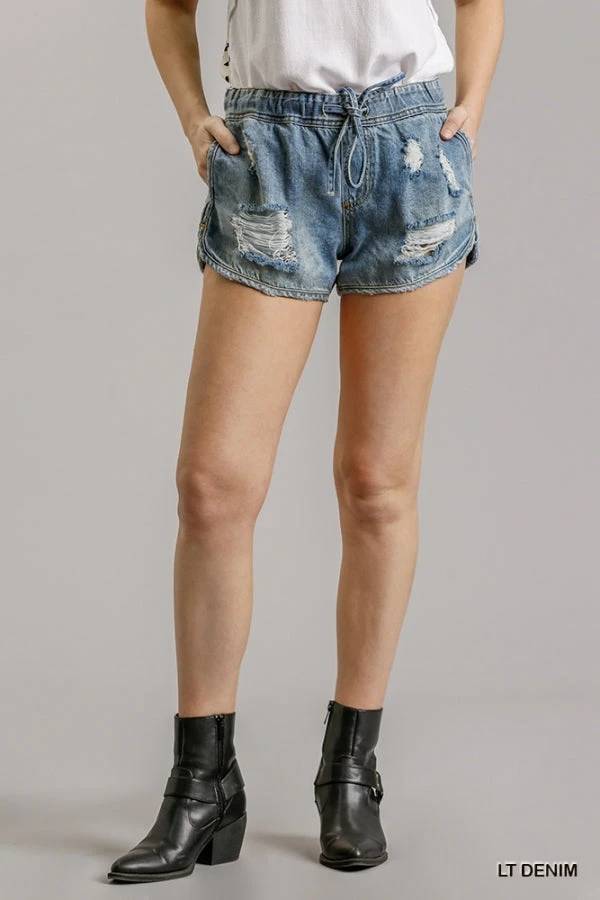 Distressed Detail Elastic Waistband and Drawstring Denim Shorts with Pockets