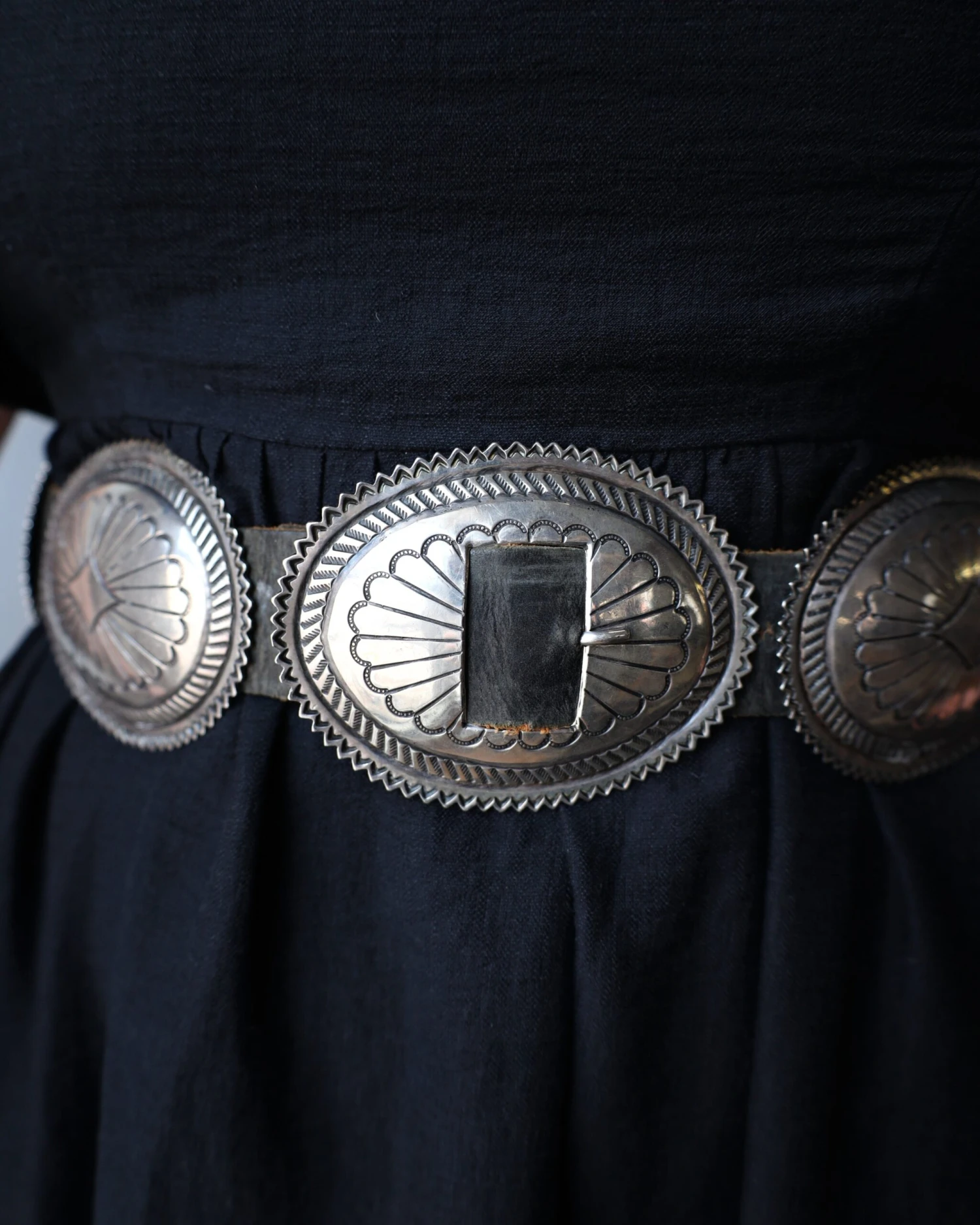 Crafted from high-quality black leather, this belt features a series of intricate sterling silver conchos, adding a touch of elegance and charm to the rugged design. At 37 inches long, this belt is adjustable to fit a variety of waist sizes, ensuring a comfortable and secure fit for all wearers.