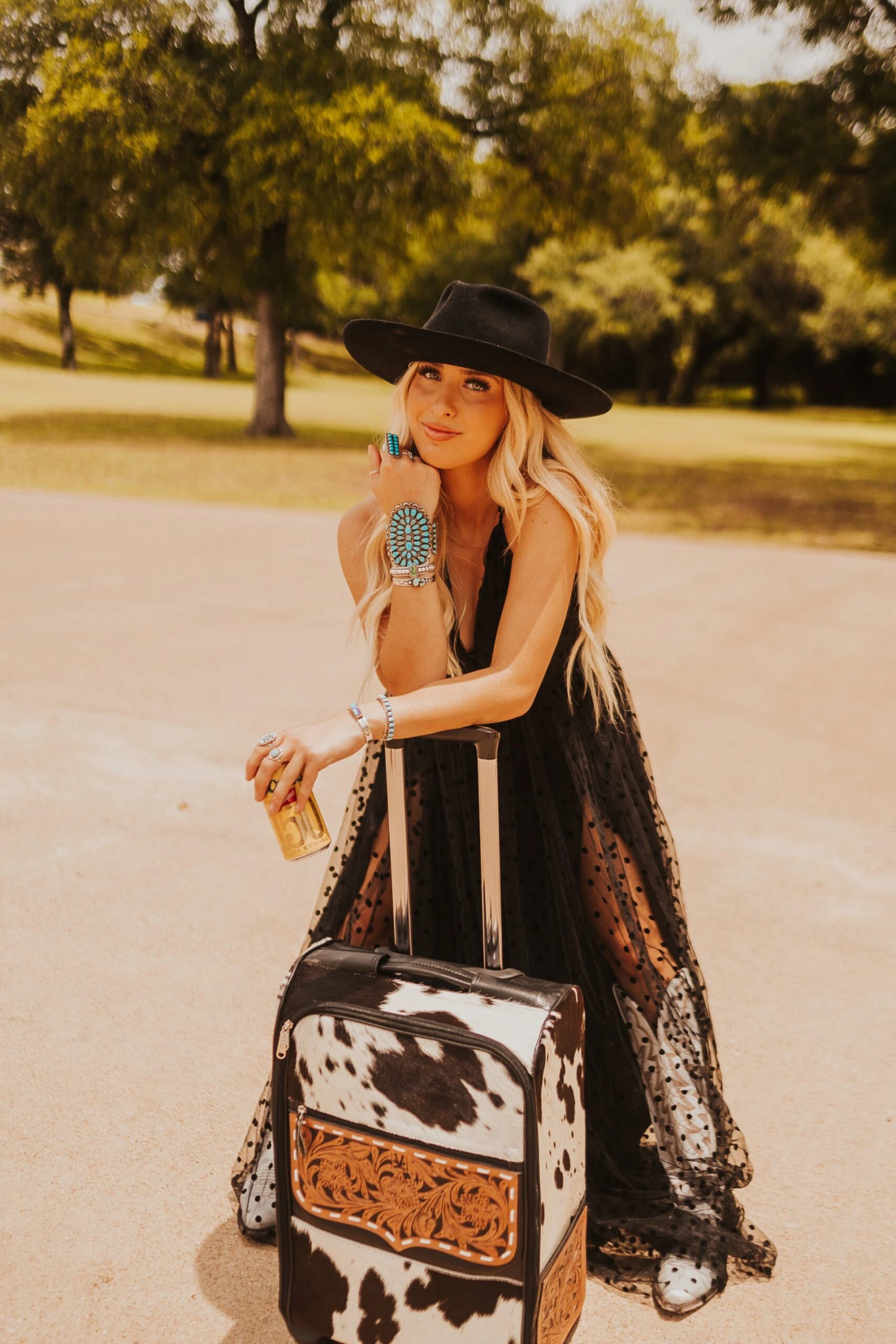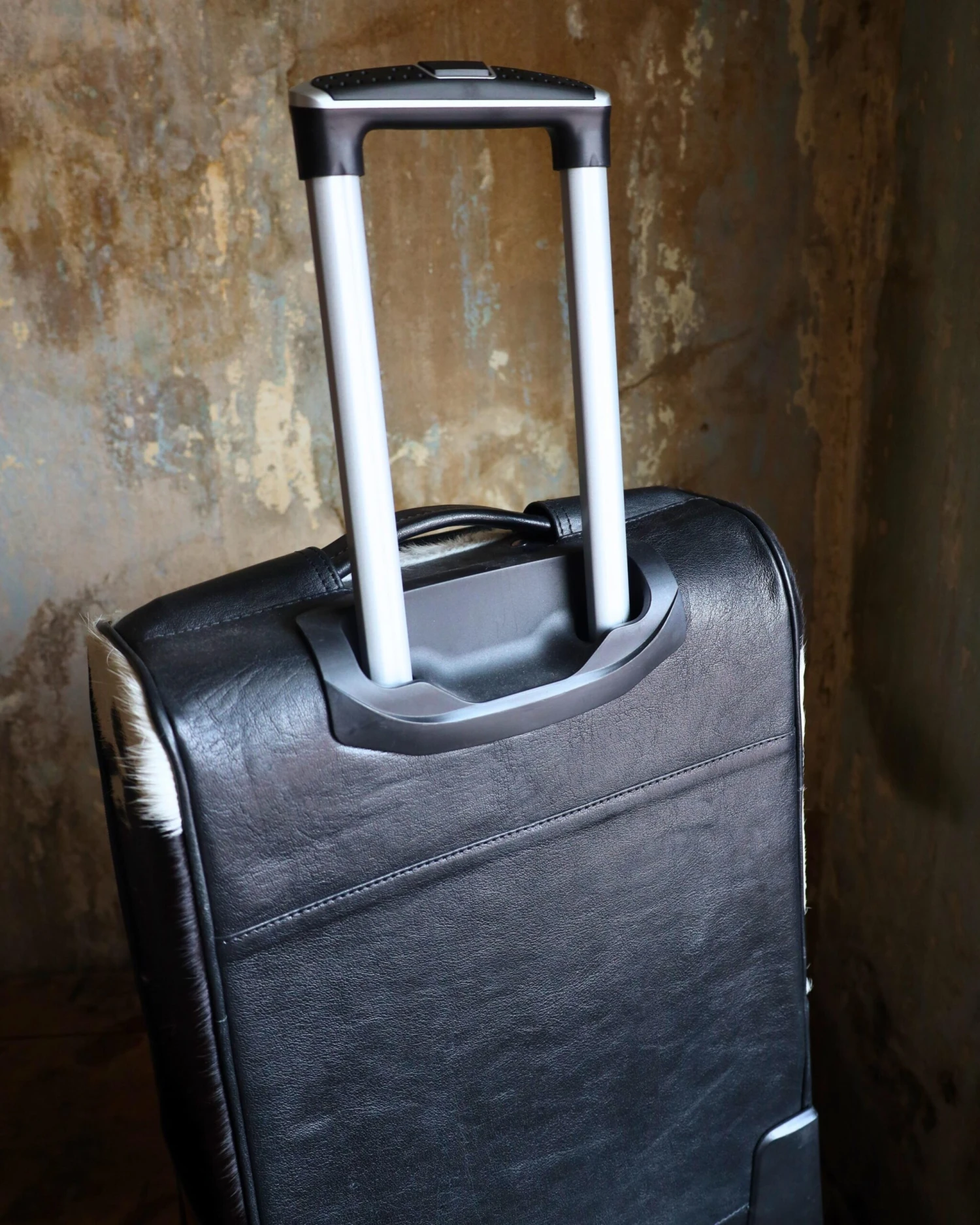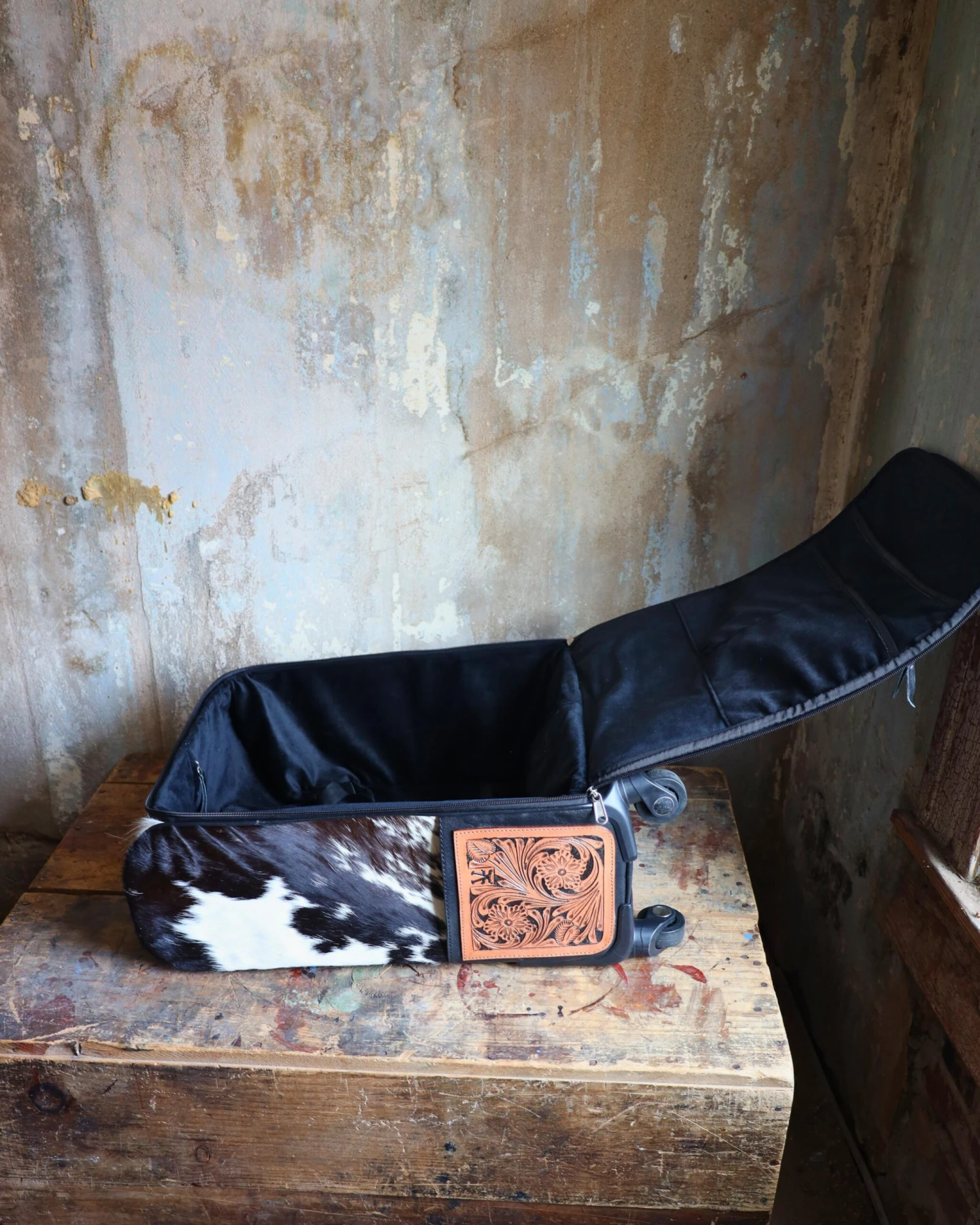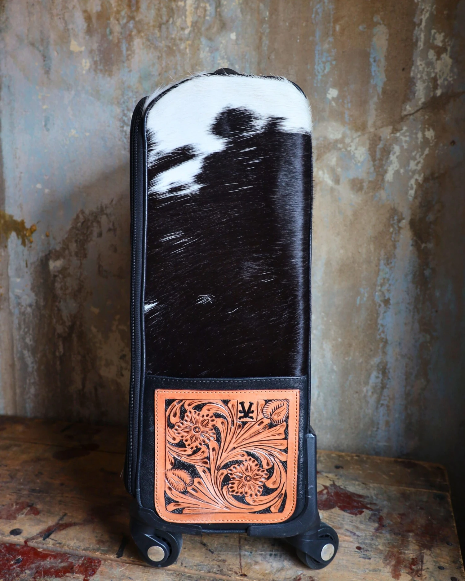 Rolling suitcase with hair on cowhide and genuine leather. Measures 21”x14”x8”. Perfect carry on size. Tooled leather Pockets on each side, pocket on outside front and two large pockets inside. Black velvet interior. This had 360” turning wheels, very smooth, telescoping handle.