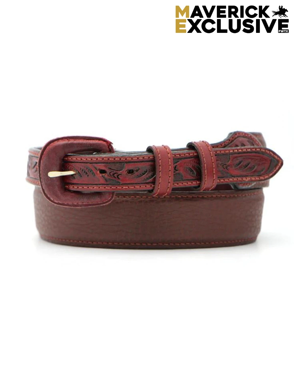 Created special from Vogt just for The Maverick, this belt is constructed from genuine top grain brown bison leather. Intricate oak leaf tooling is featured on the billet overlays. 1-3/8″ wide with a 1″ taper. Created by hand by Vogt in Mexico.